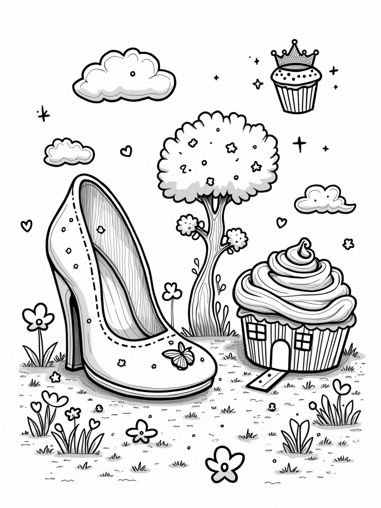 Dreamland Playhouse: Giant High-Heeled Shoe and Cupcake Slide Coloring Page