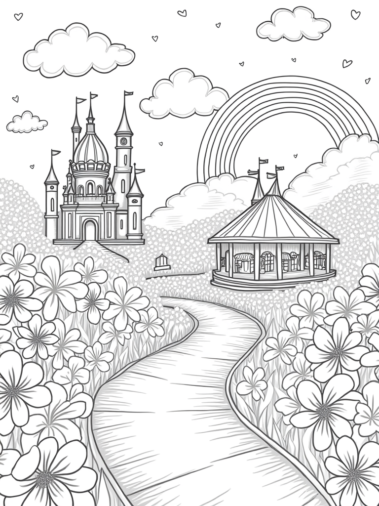 Above the whimsical landscape, fluffy clouds shaped like hearts float lazily by. And don’t forget about the stunning rainbow arcing gracefully across the sky! It’s sprinkled with tiny hearts and stars, making this dreamy place even more enchanting. Grab your favorite colors and bring this imaginative scene to life!