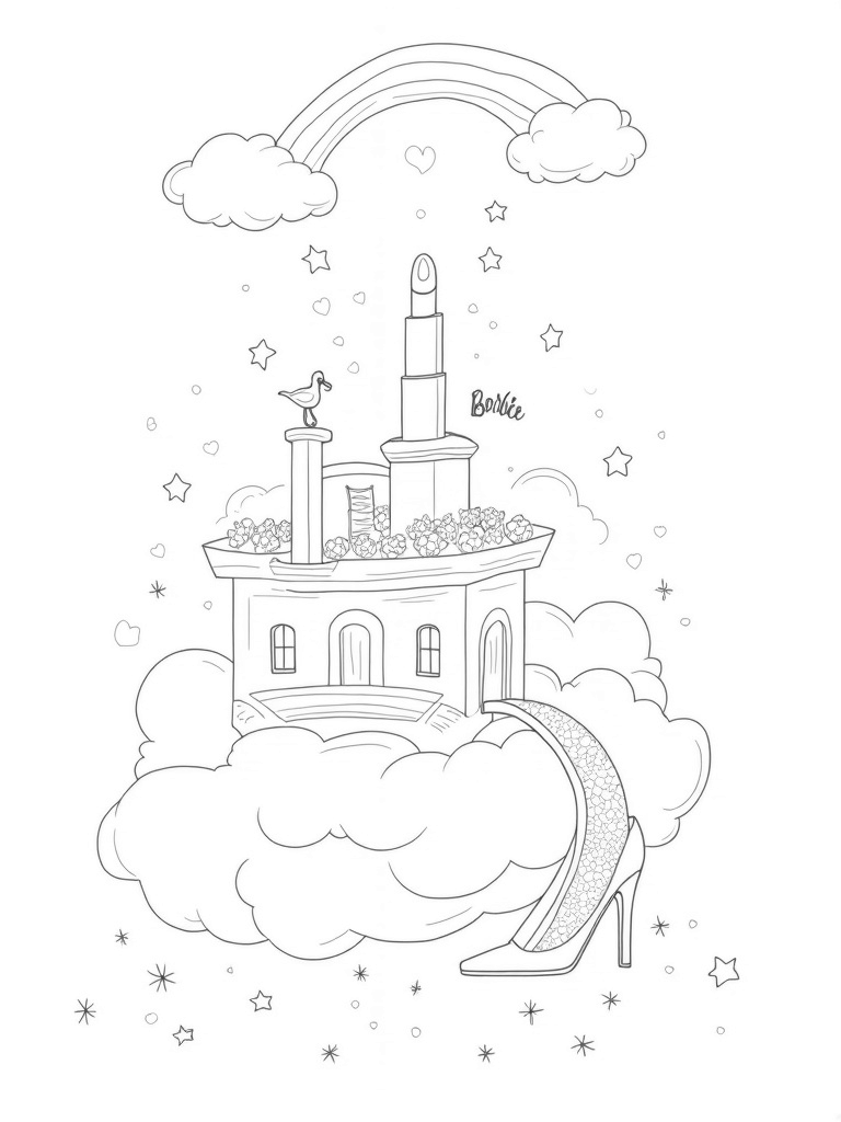Check out this free, printable coloring page featuring a dreamy Barbie dreamhouse floating in the clouds! With a giant lipstick tower and a sparkling shoe slide, it's perfect for kids who love Barbie and whimsical fun.