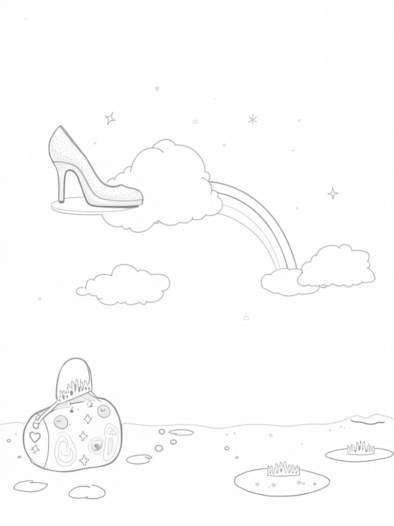 In the foreground, there's an enormous glittery handbag that's not just stylish but also covered in cute charms shaped like hearts and stars. And if you look closely in the background, you’ll see a rainbow stretching over a shimmering lake, where lily pads float with tiny tiaras. It’s a magical blend of fashion and fun that’s perfect for creative minds!