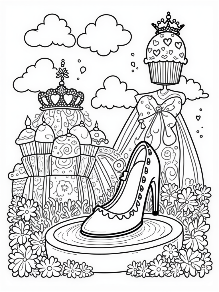 Dreamy Fashion Wonderland with High-Heeled House and Cupcake Mountain Coloring Page