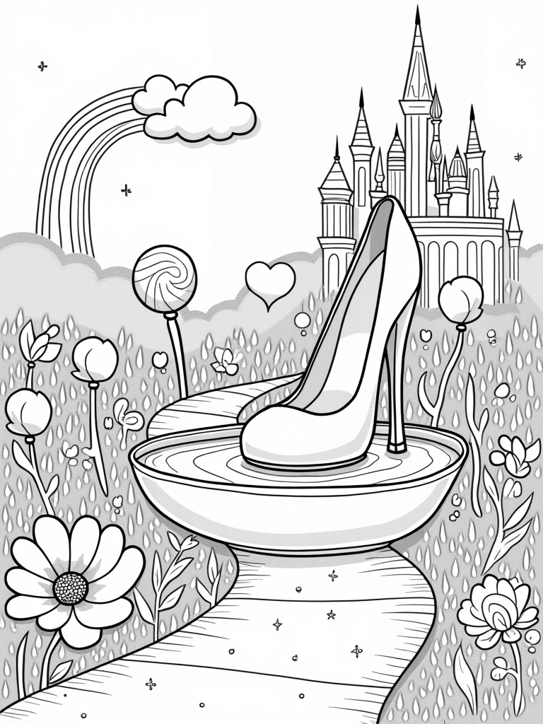 Dreamy Landscape with Crystal Shoe Fountain and Candy Castle Coloring Page
