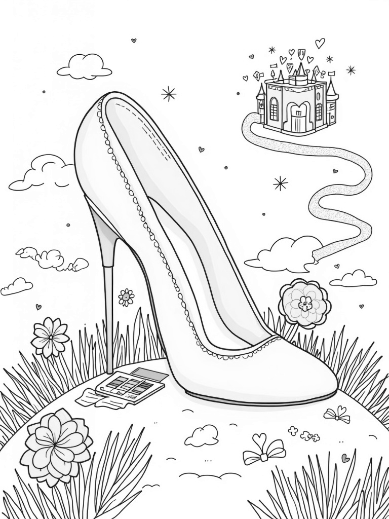 This page showcases a giant pink high-heeled shoe that’s transformed into a cozy little house! Complete with windows and a tiny balcony, it’s a fun place for imaginative play. Surrounding the shoe are oversized flowers in lovely pastel colors, with petals that look like soft fabric swatches. It’s like a magical garden where everything is just a bit bigger and brighter!