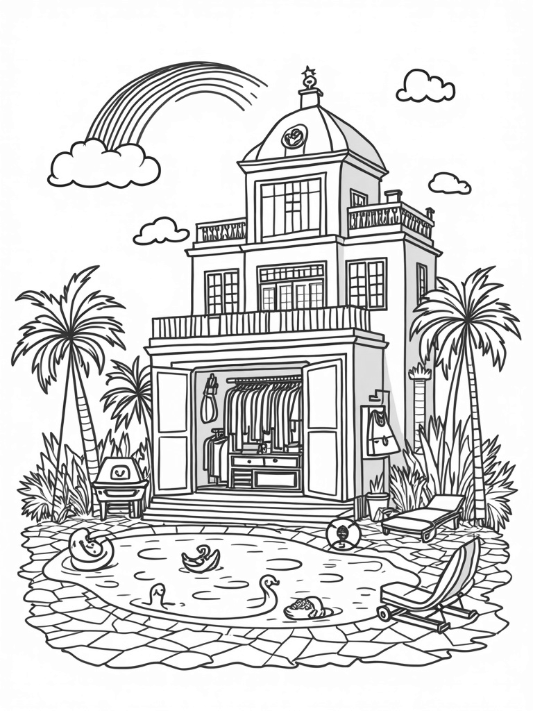 Dreamy Pink Mansion with Fashion Closet and Pool Coloring Page