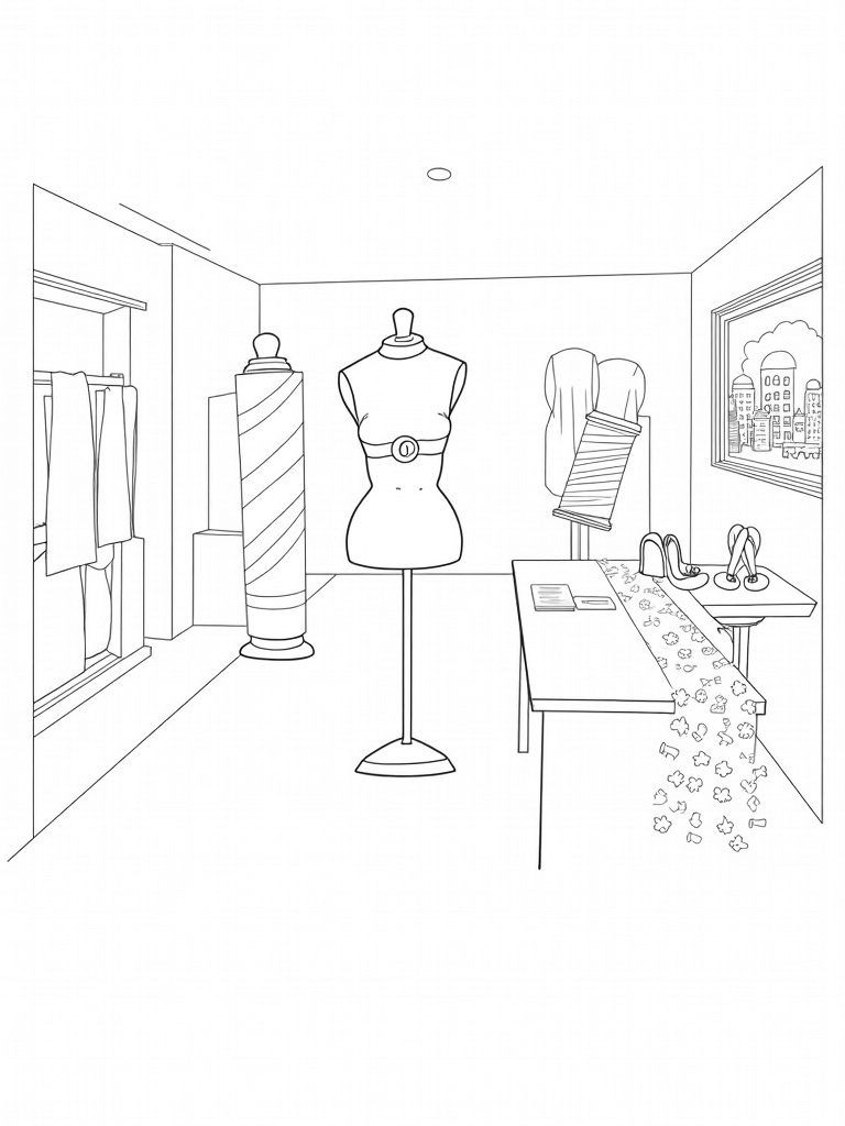 In the background, there’s a window that shows a whimsical skyline with playful, pastel-hued buildings. It adds a magical touch to the atelier, making it the perfect spot for budding fashion designers to let their imaginations run wild. Grab your crayons and get ready to bring this fabulous scene to life!
