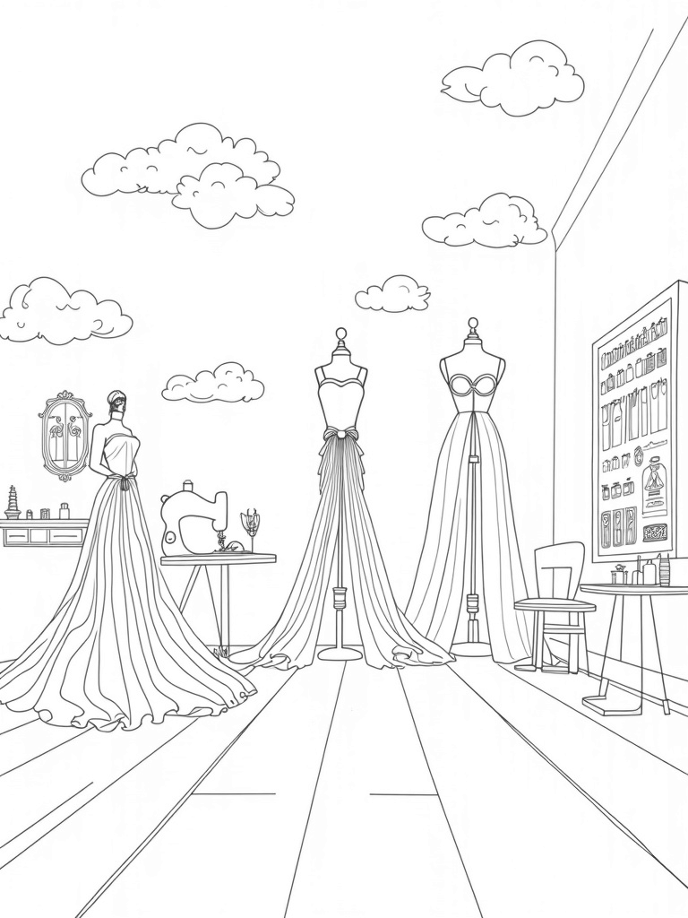 The wall features a giant mood board filled with magazine clippings and sketches that inspire fashion lovers. You can spot sparkling accessories and stylish outfits ready to be brought to life. Above it all, fluffy clouds float, each holding tiny star-shaped accessories, making this studio feel like a dreamy paradise for any budding designer.