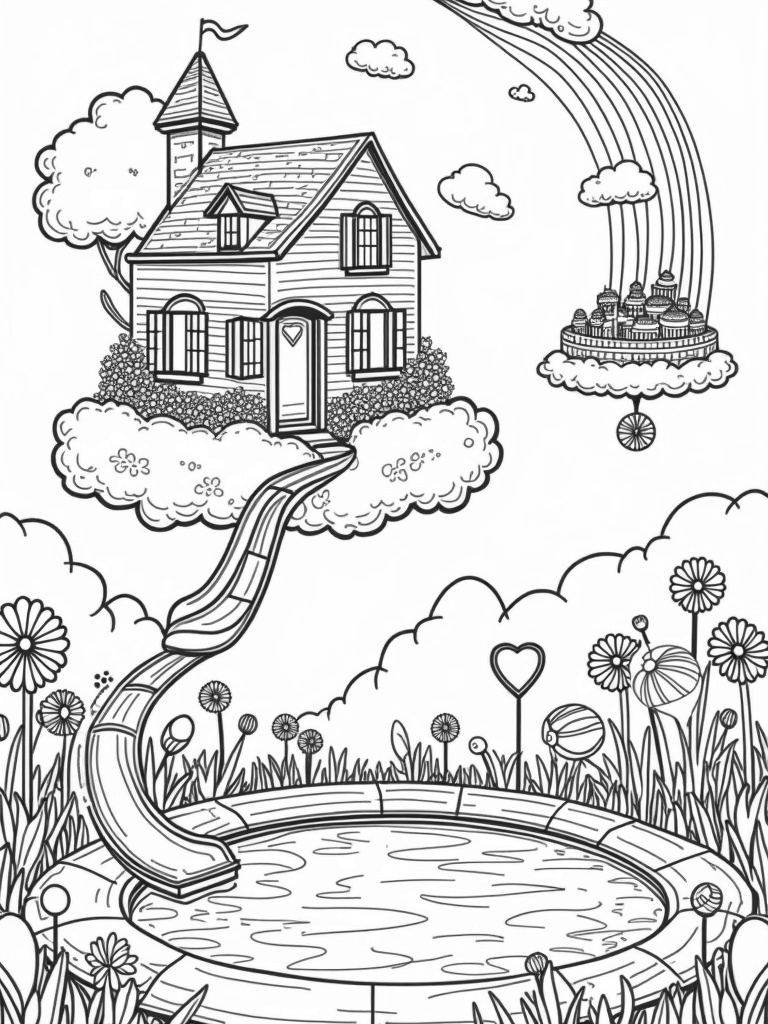 This coloring page showcases a dreamy house floating on a fluffy cloud, complete with pastel shutters and huge flowers. In the foreground, a giant pink high-heeled shoe acts as a slide, leading to a garden filled with colorful lollipops. It’s a sweet scene that sparks the imagination!