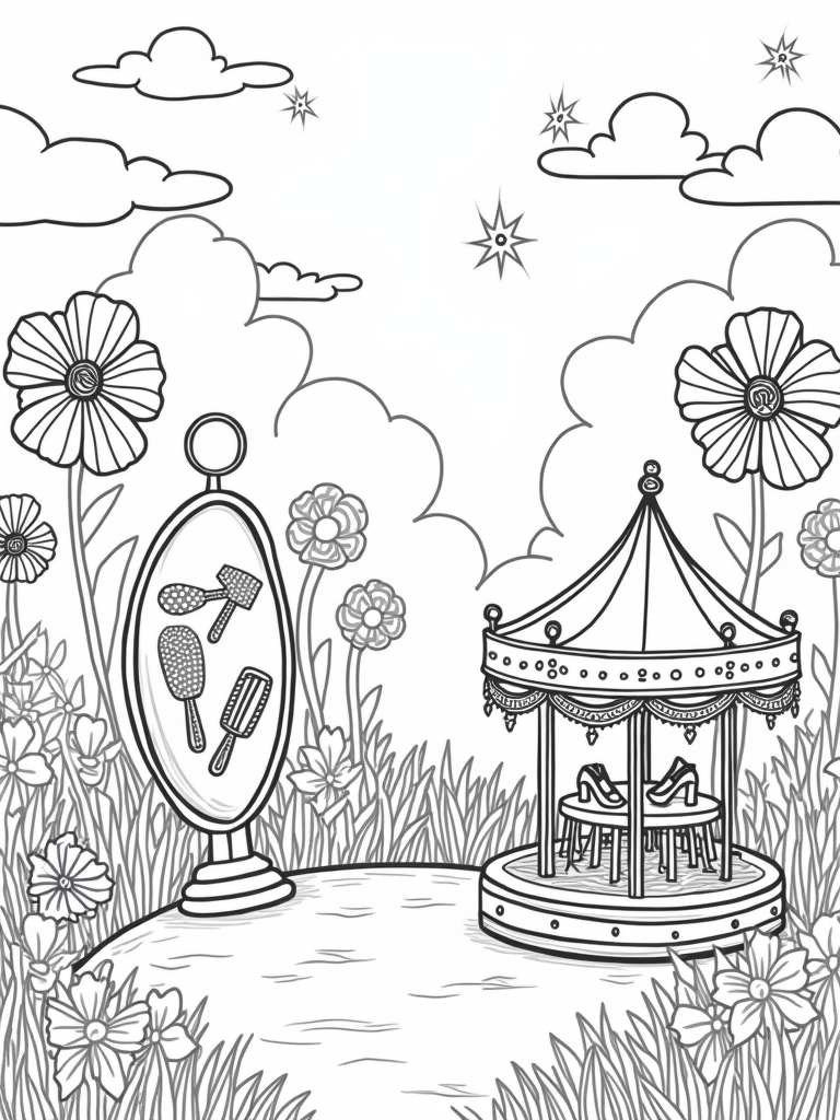 Giant Flowers and a Sparkling Vanity in Dreamland Coloring Page
