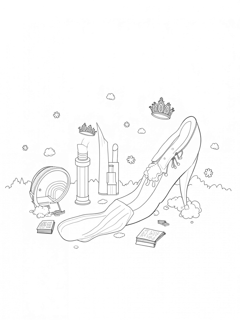 In this fun coloring page, you’ll find a giant pink high heel that doubles as an awesome slide! Imagine sliding down into a fluffy cloud of cotton candy—how sweet is that? Nearby, a huge lipstick tube is spilling colors all over the ground, making everything look like a playful art project. And don't miss the sparkling tiara floating above a shiny mirror that reflects a rainbow sky. It’s like a fashionista’s dream come true!
