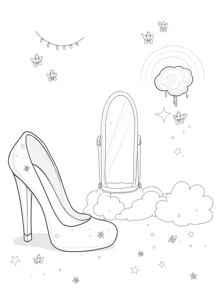 In the background, a shimmering mirror reflects a beautiful rainbow arch while delicate butterflies dance around. It’s a place where imagination runs wild! You can let your creativity soar as you pick your favorite colors for the stars that scatter like confetti throughout the scene. This page is perfect for little fashionistas who love to dream big!