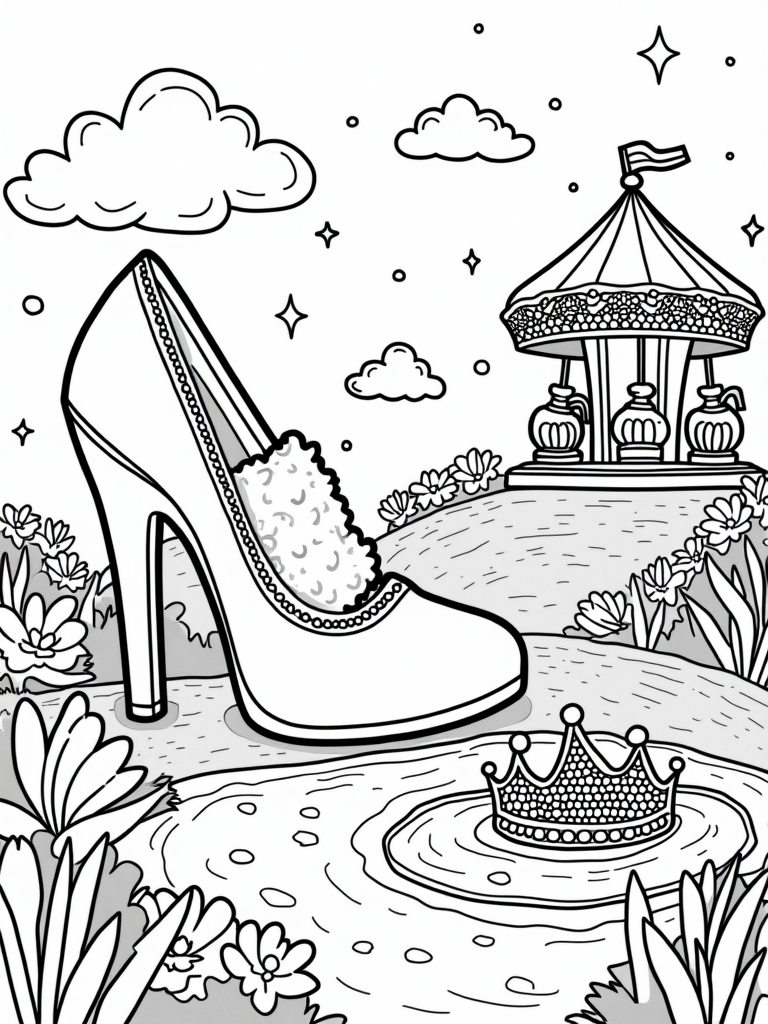 Giant Pink High-Heeled Shoe and Dreamy Carousel Coloring Page