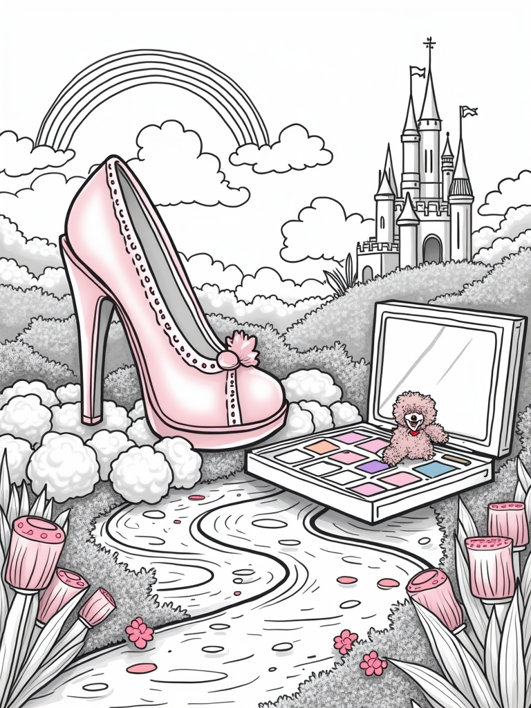Imagine a dreamland where everything is bigger and bolder! Right in the middle, there's a gigantic pink high-heeled shoe that acts as a super fun slide, leading straight into a sparkling pool of glittering water. Nearby, a huge makeup compact opens up to reveal a rainbow of colorful lipsticks and eyeshadows just waiting to be colored in. And if you look up, you’ll spot a playful poodle lounging on a fluffy cloud, soaking up the sunshine.