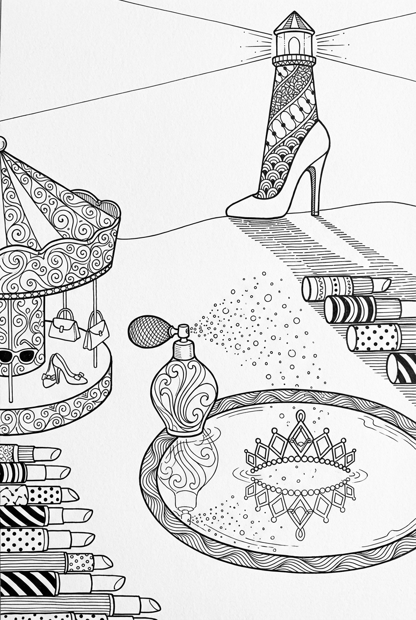 Right in the middle of the page you’ll see a towering pink high‑heel that doubles as a lighthouse, its long shadow stretching over a runway made from sleek lipstick tubes. Next to it, a tiny carousel spins with sunglasses, handbags, and little shoes on a marble platform. At the heart of the scene a graceful perfume‑bottle fountain sprays sparkling mist into a shallow pond, and a glittering tiara floats on the water’s surface, reflecting everything around it.