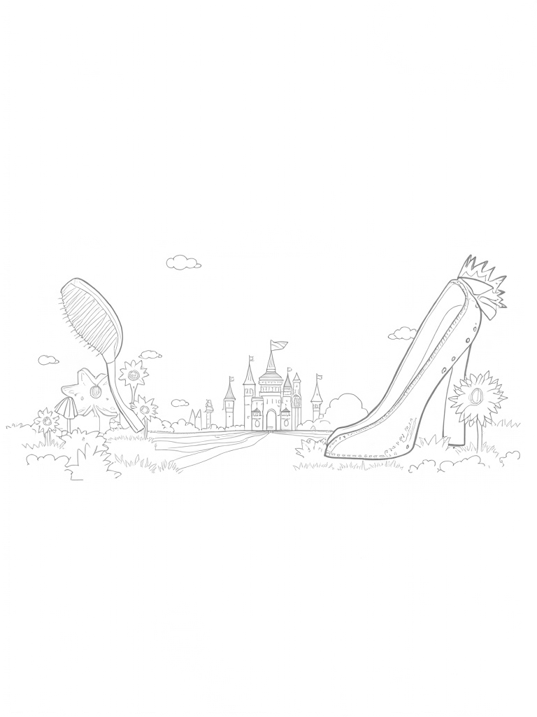 In this enchanting scene, you’ll find a winding path made of oversized pink high heels that leads through a candy-colored landscape. It's a playful place where vibrant flowers with star-shaped petals bloom alongside the path, each holding a tiny mirror that catches the light. Above, a giant hairbrush stretches across two fluffy clouds, adding a touch of whimsy to the sky. And don’t forget to look for the sparkling tiara floating above, casting shimmering reflections on everything below!