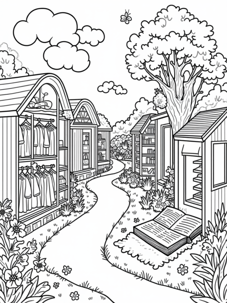 Step outside, and you’re greeted by a garden bursting with giant flowers and fluttering butterflies. It’s a magical place where nature meets creativity. Look up, and you’ll see a treehouse nestled among the branches, twinkling with fairy lights. A winding path connects each room, leading to a sunny sky filled with fluffy clouds, perfect for daydreaming.
