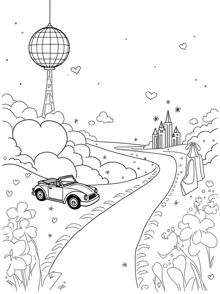 Pastel Dreamscape with Disco Ball and Convertible Car Coloring Page