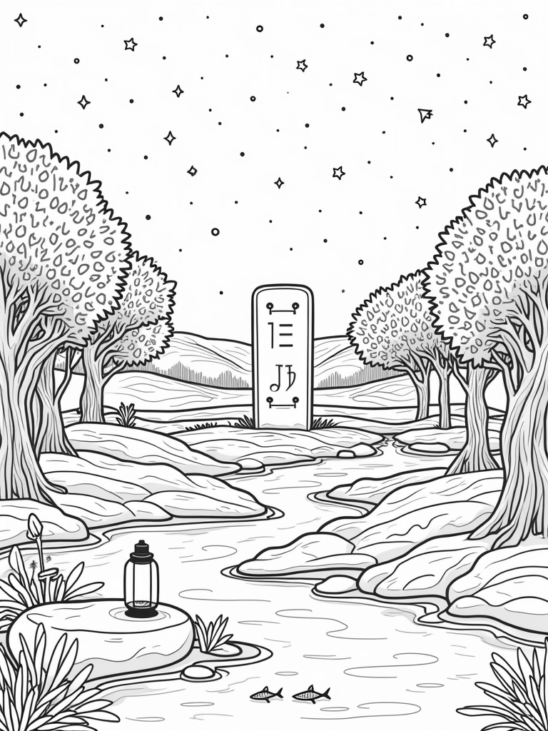 Imagine a beautiful, ancient olive grove that stretches as far as the eye can see. The olive trees are tall and twisty, with gnarled branches that look like they’ve been shaped by time itself. In the center, there's a large stone tablet with bold symbols, hinting at stories from long ago. A gentle river flows nearby, and if you look closely, you might even spot little fish swimming beneath the surface. It's a peaceful scene, perfect for a relaxing coloring session.