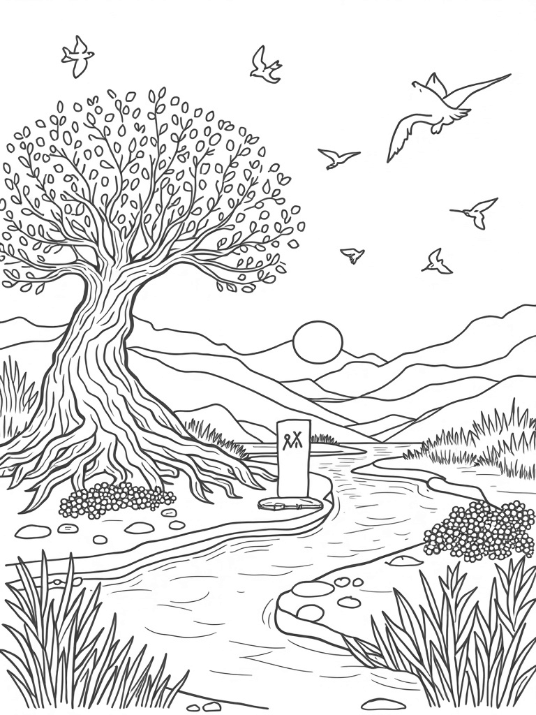 Ancient Olive Tree in a Tranquil Garden Coloring Page