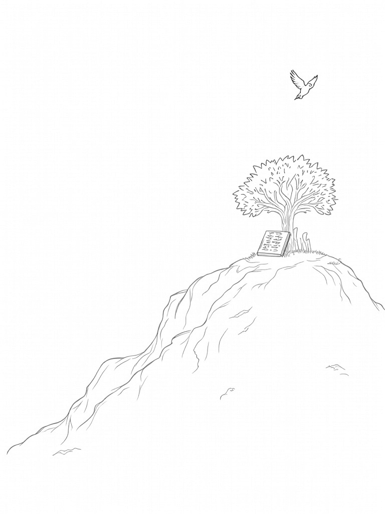 This illustration shows a peaceful mountaintop with a stunning glowing tablet covered in ancient symbols. Below, cascading waterfalls tumble off the cliff, creating lovely pools surrounded by leafy vines and smooth stones. Nearby, a group of olive trees stands proudly, their twisted branches and shimmering leaves adding to the tranquil scene.