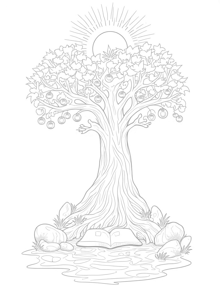 Above this magical tree, the sun shines brightly, filtering through the leaves and casting warm, golden beams all around. You might spot a flock of doves soaring gracefully in the sky, adding to the serene vibe. And don't forget about the scattered boulders nearby—each one features intricate carvings that tell stories of peaceful landscapes and celestial wonders. It's a perfect spot for kids to color and let their imaginations run wild!