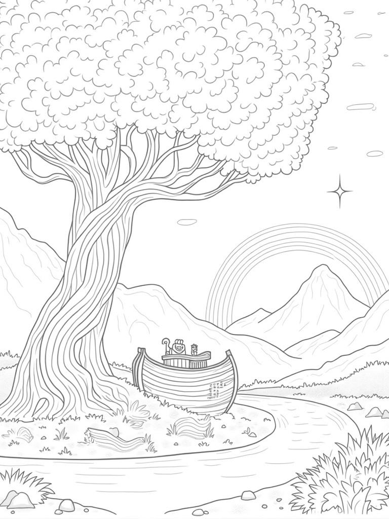 Check out this free, printable coloring page featuring a towering ancient tree, an ark, and a vibrant rainbow. Perfect for kids who love Bible stories, this design offers a fun and creative way to explore nature while coloring!