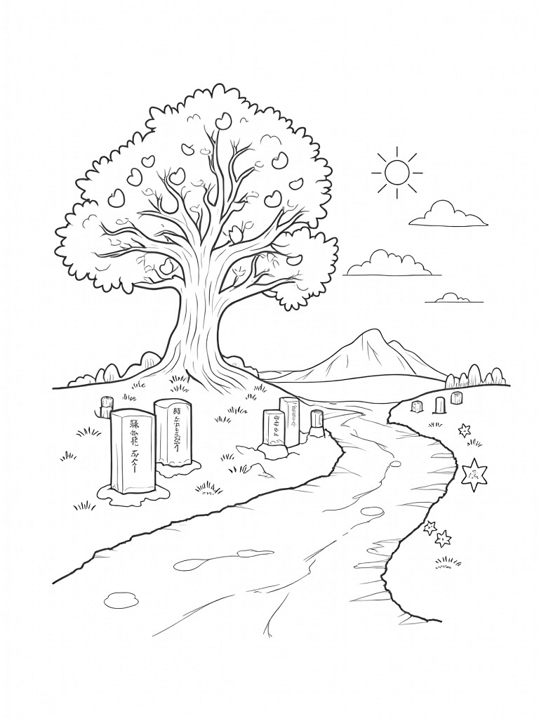 In the background, majestic mountains rise high, with a radiant sun peeking over their peaks, sending bright rays of light throughout the scene. A winding path invites you to explore this magical place, leading right up to the tree. It’s a perfect spot for little imaginations to run wild while coloring!
