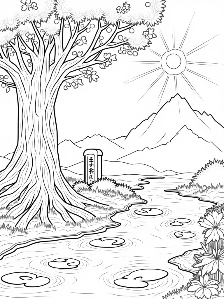 Right next to the river, there’s a stone tablet standing tall, etched with mysterious symbols that make you wonder what they mean. Surrounding this tablet are blooming flowers, adding splashes of color to the scene. And in the background, a soft silhouette of a mountain rises, its peak kissed by a radiant sunburst, casting a warm, golden glow over everything. It’s a perfect spot for some creative coloring!
