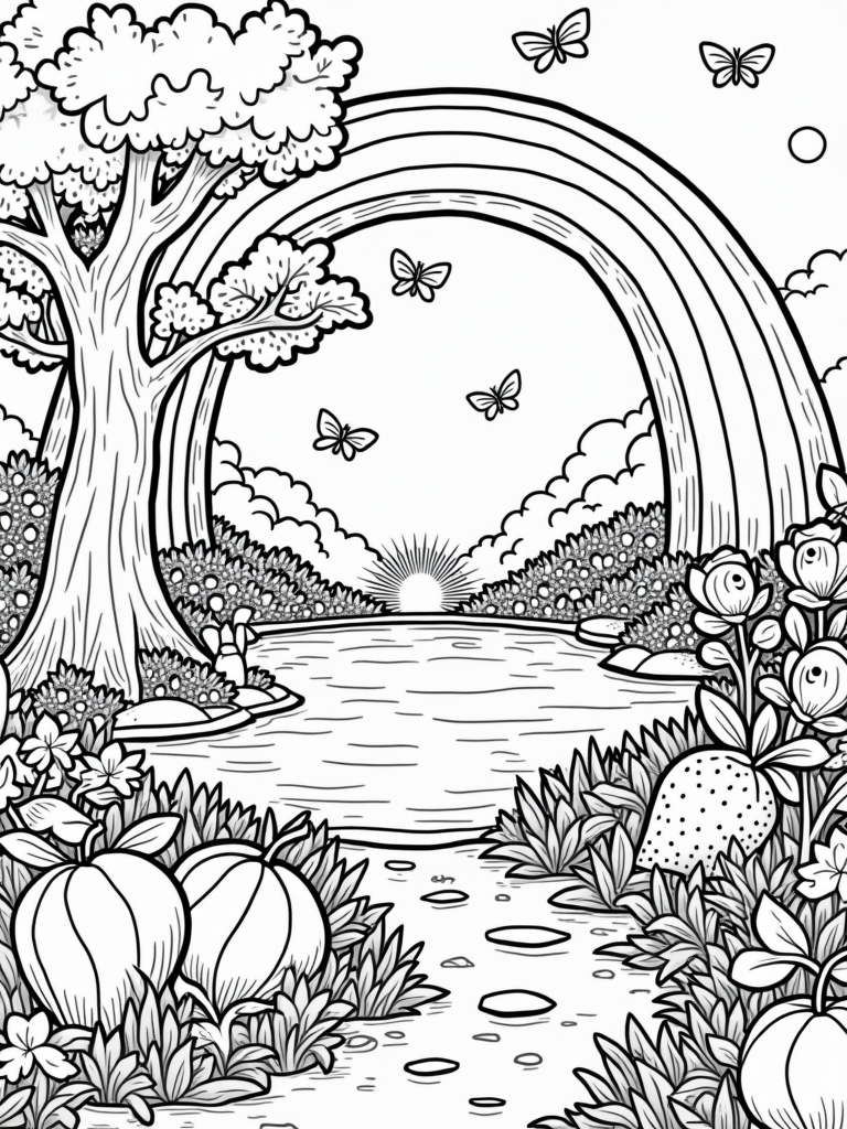In this charming garden, you'll find oversized fruits and vibrant plants that just beg to be colored. A giant rainbow stretches across the scene, casting its cheerful colors onto a shimmering pond below. To the side, a playful tree with spiraling branches creates a cozy spot, inviting birds to perch and sing among the leaves. Scattered throughout are adorable rabbits and butterflies, peeking out from behind colorful flowers, adding a touch of whimsy to the whole scene.