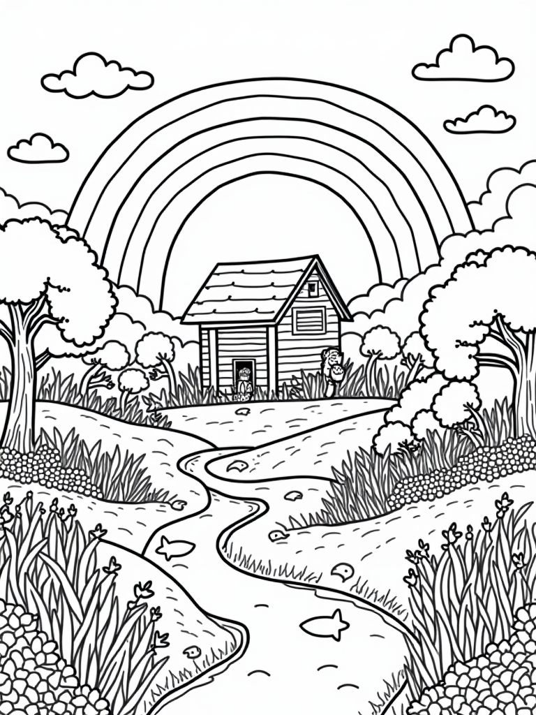 A winding stream flows nearby, filled with cheerful fish that seem to be dancing in the water. Above, soft clouds drift lazily, each shaped like a different biblical symbol. It’s a delightful mix of nature and fun, perfect for sparking creativity in kids as they bring this scene to life with their favorite colors.