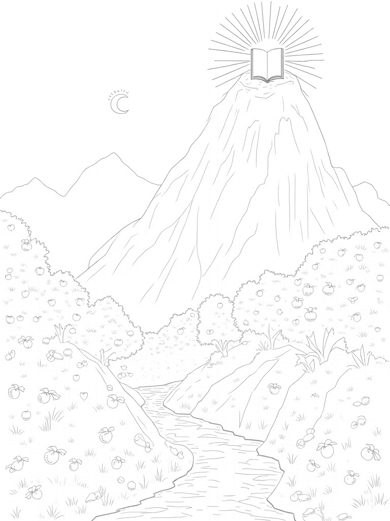 This scene is all about a stunning mountain range made of ancient stone, standing tall and proud. At the very top, there's a winding path that leads to a beautiful, open scroll. It looks like something special is written there, just waiting to be discovered! Down below, the valley is bursting with life, filled with vibrant fruit trees that are heavy with colorful apples and pomegranates. Can you imagine those delicious fruits?