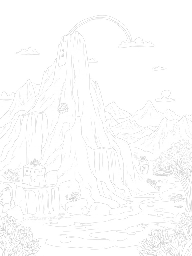 As you color, notice the glowing lanterns hanging from the branches of the olive tree, casting a warm light over the colorful flowers that surround it. A vibrant rainbow arches gracefully across the sky, connecting the majestic mountain to rolling hills in the distance. It’s a perfect setting for bringing your imagination to life!