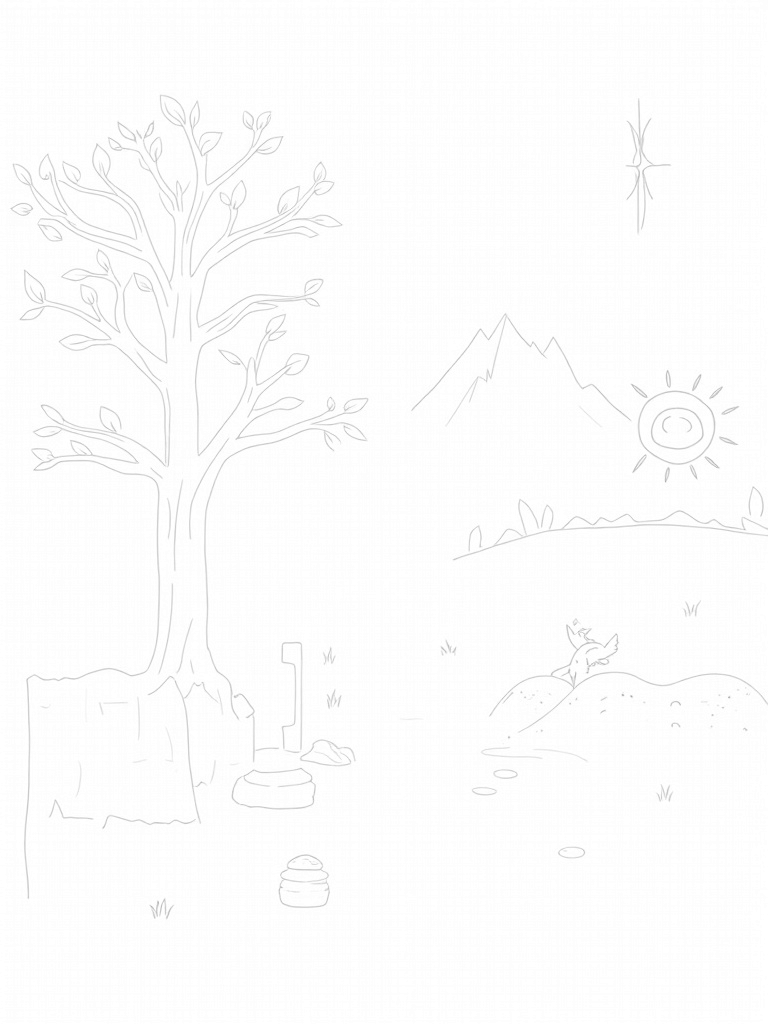 You’ll find a stunning tree of life with sprawling branches, each one bursting with colorful fruit and delicate leaves. At the base, a shimmering river flows gently, with smooth stones that look like ancient tablets scattered along the shore. It’s a peaceful scene that invites creativity!