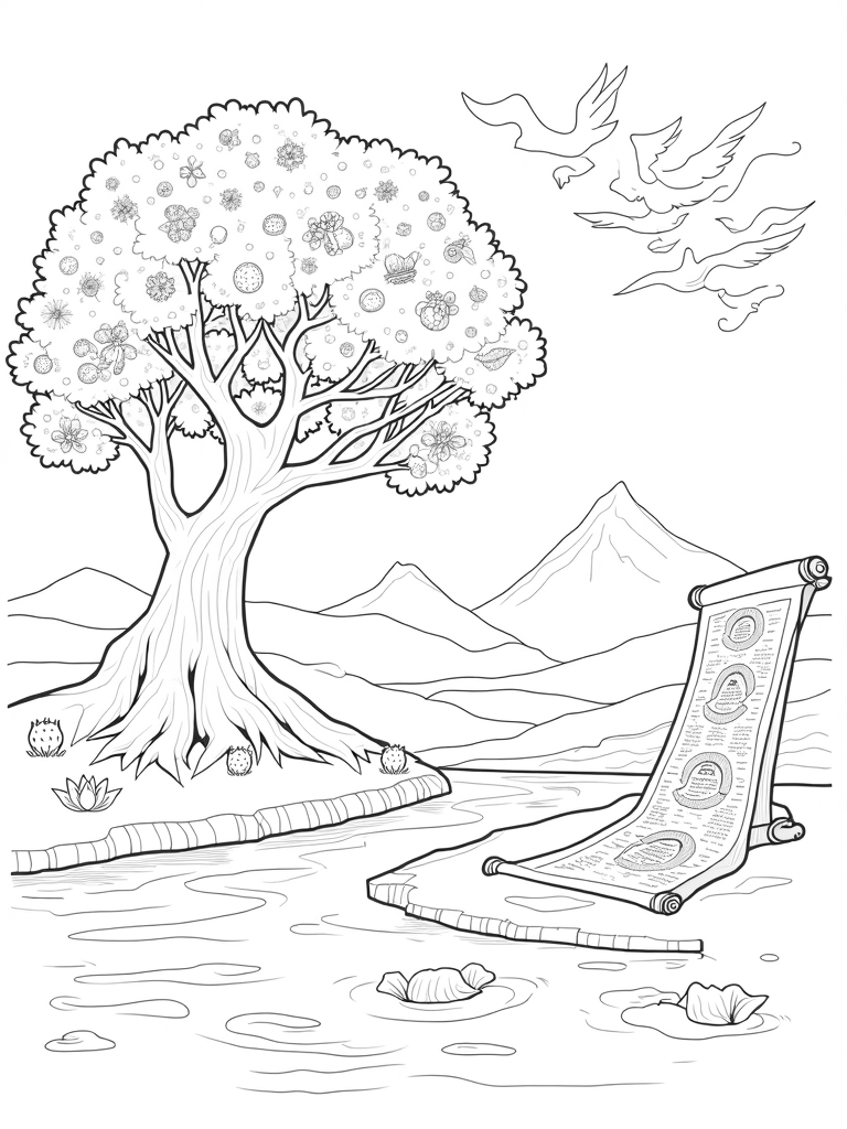 Check out this free, printable coloring page featuring a majestic tree of life, a shimmering river, and an ancient scroll with biblical stories. Perfect for kids who love to color and learn about nature and history!