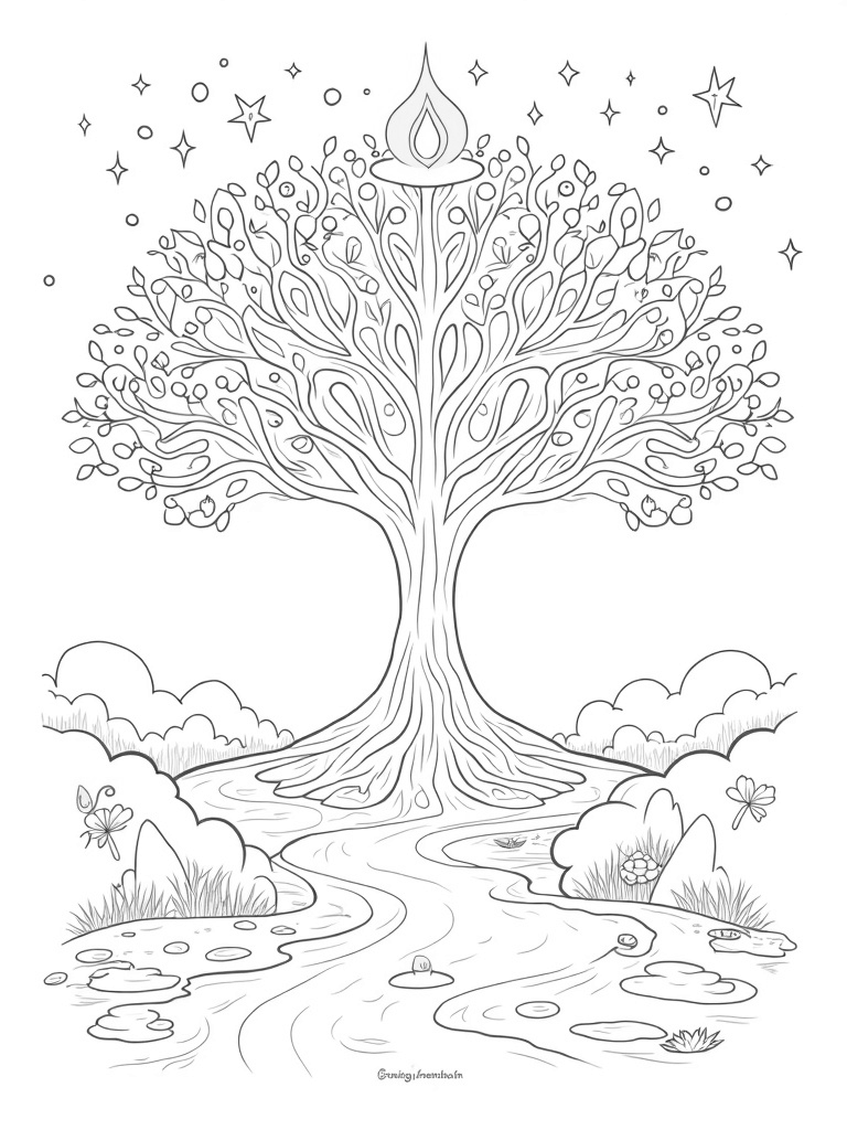 At the heart of this coloring page is a stunning tree of life, its branches stretching wide with beautifully detailed leaves and jewel-like fruits. Below, a serene river flows, sprinkled with smooth stones and lily pads that add a touch of nature's charm. Look up, and you’ll see twinkling stars forming a magical halo around the tree.