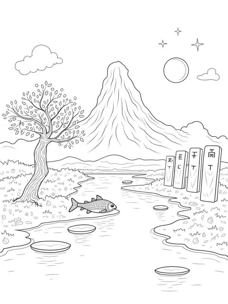 Look at this amazing scene! A towering mountain with a split peak rises majestically against a backdrop of fluffy clouds. Above it, a brilliant sun peeks through, casting a warm glow over everything. At the base of the mountain, a shimmering river flows, its surface dotted with lily pads. And check out that large, ornate fish leaping out of the water—it's like it's ready to splash right onto your page!