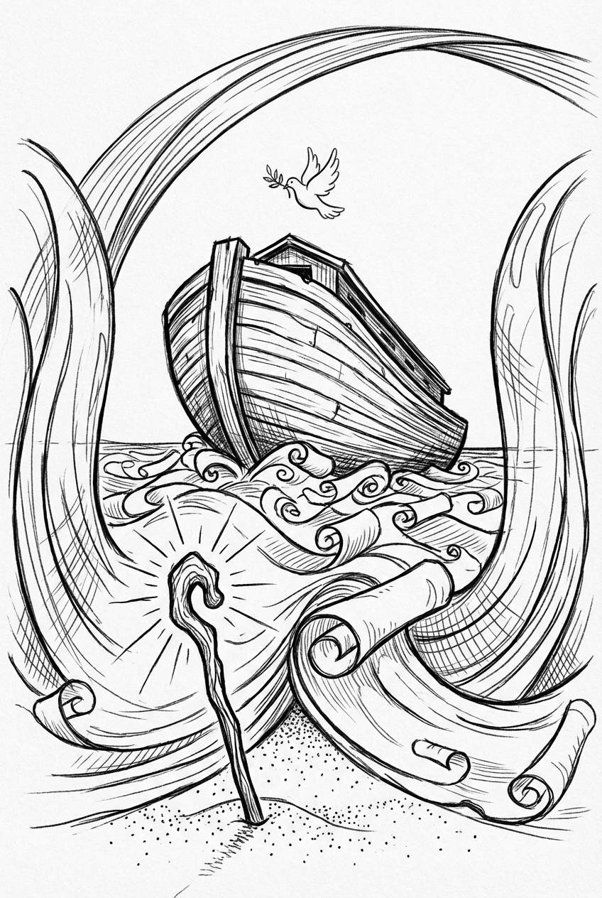 Try cool blues for the water pillars, warm browns for the ark’s wood, and a bright rainbow of reds, oranges, and greens across the sky. The dove looks great in soft gray or white, and the olive branch can be a fresh green. Have fun mixing colors and making the picture your own.