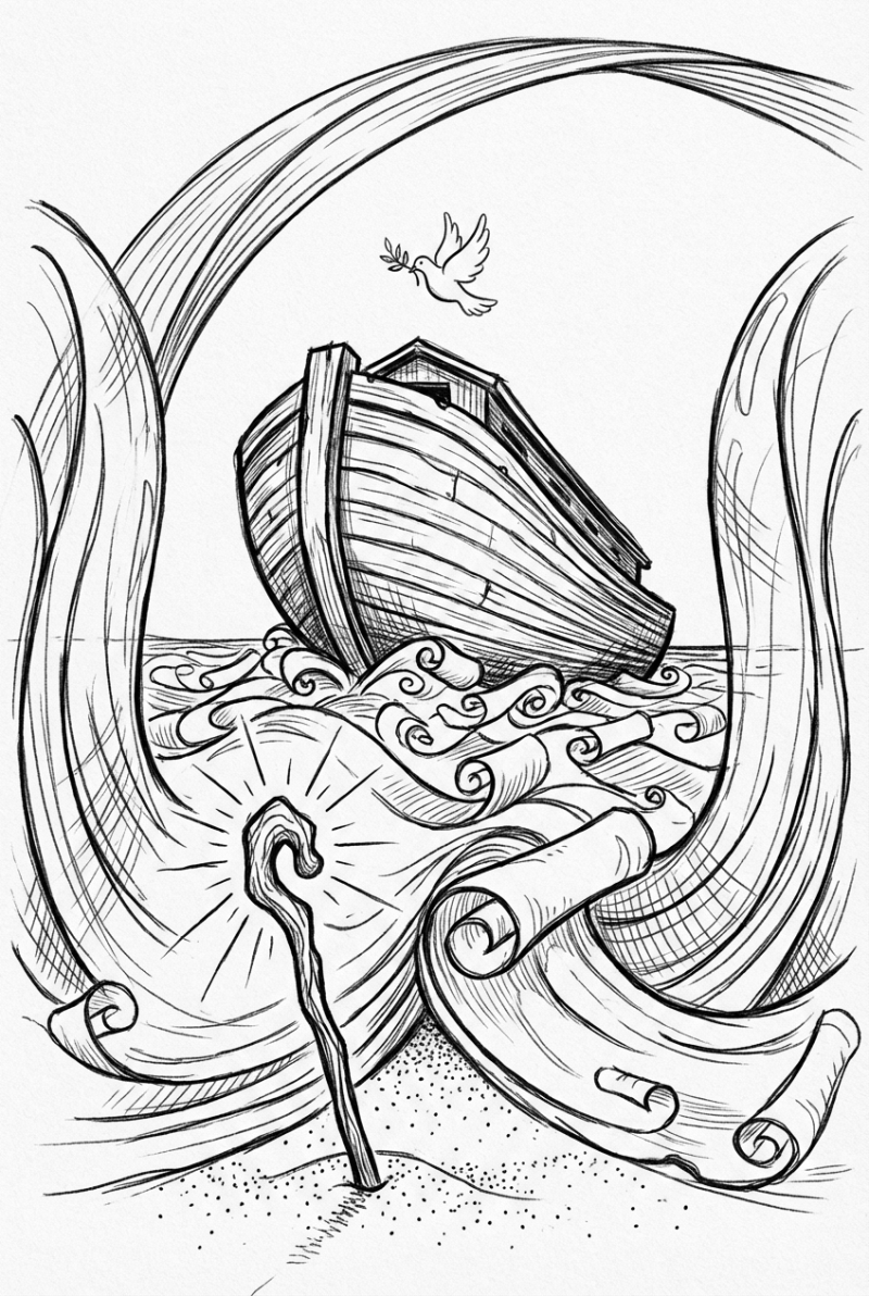 Look closely and you’ll spot a massive wooden ark, its sturdy beams curving over a shimmering sea that looks like glowing parchment. On each side, tall walls of water stand like clear glass pillars, and a bright staff planted in the sand splits the waves in two. Above it all, a rainbow ribbon of light arches across the sky while a gentle dove with an olive branch hovers nearby, a quiet sign of peace.