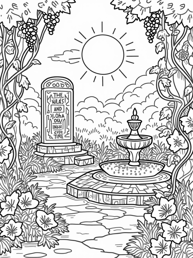 Serene Garden with Ancient Tablet and Whimsical Fountain Coloring Page