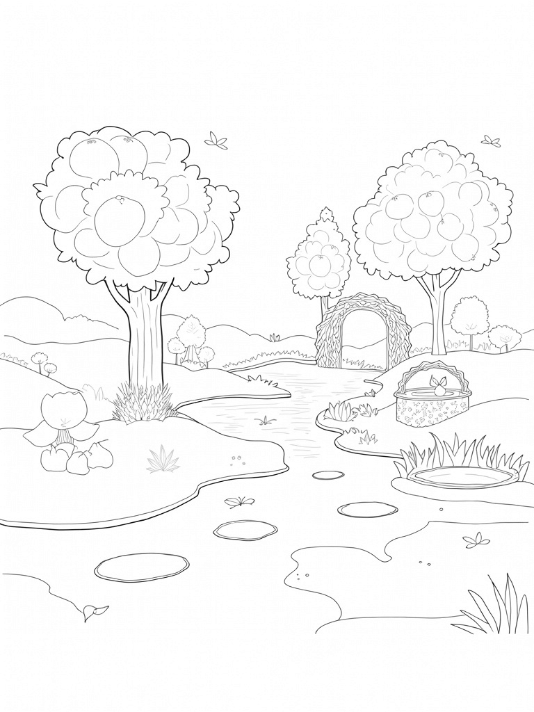 Check out this free, printable coloring page featuring a serene garden filled with fruit trees, a tranquil pond, and a charming archway. Perfect for kids who love to color! Enjoy bringing this peaceful scene to life.