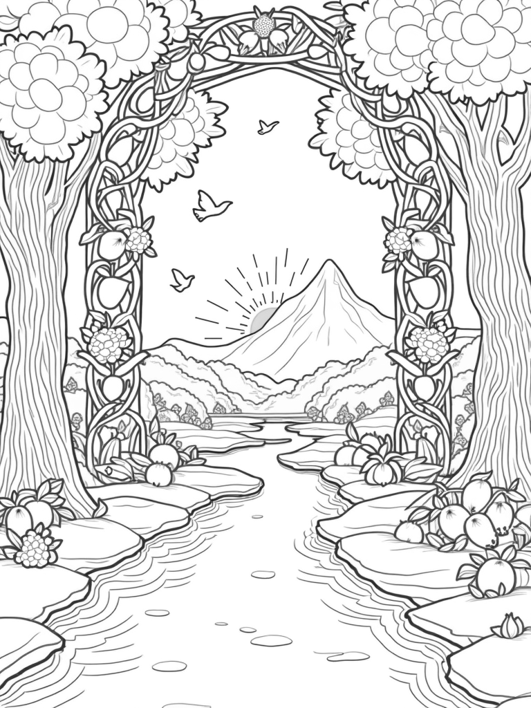 This beautiful scene captures a serene garden filled with oversized fruit trees, their branches heavy with golden apples and vibrant pomegranates. At the heart of the garden, a shimmering river flows gently, surrounded by smooth stones that create a winding path. Above, a grand archway made of intertwined vines and colorful flowers leads your eyes toward a distant mountain peak, while delicate doves flutter gracefully in the sky.