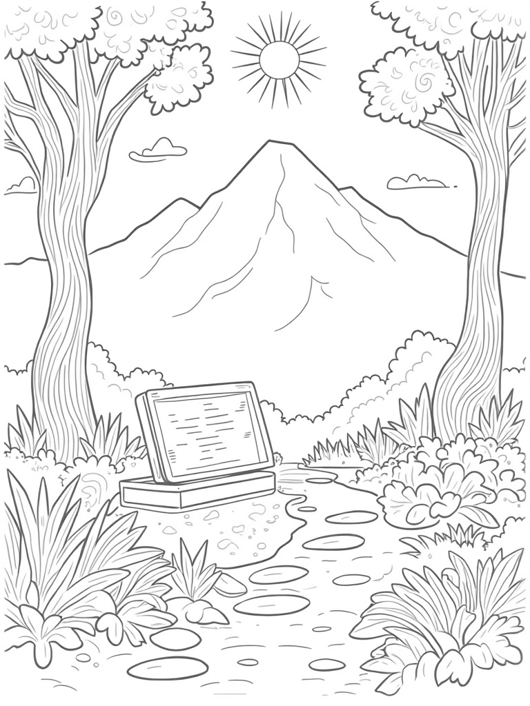 Serene Garden with Spiral Trees and Ancient Tablet Coloring Page