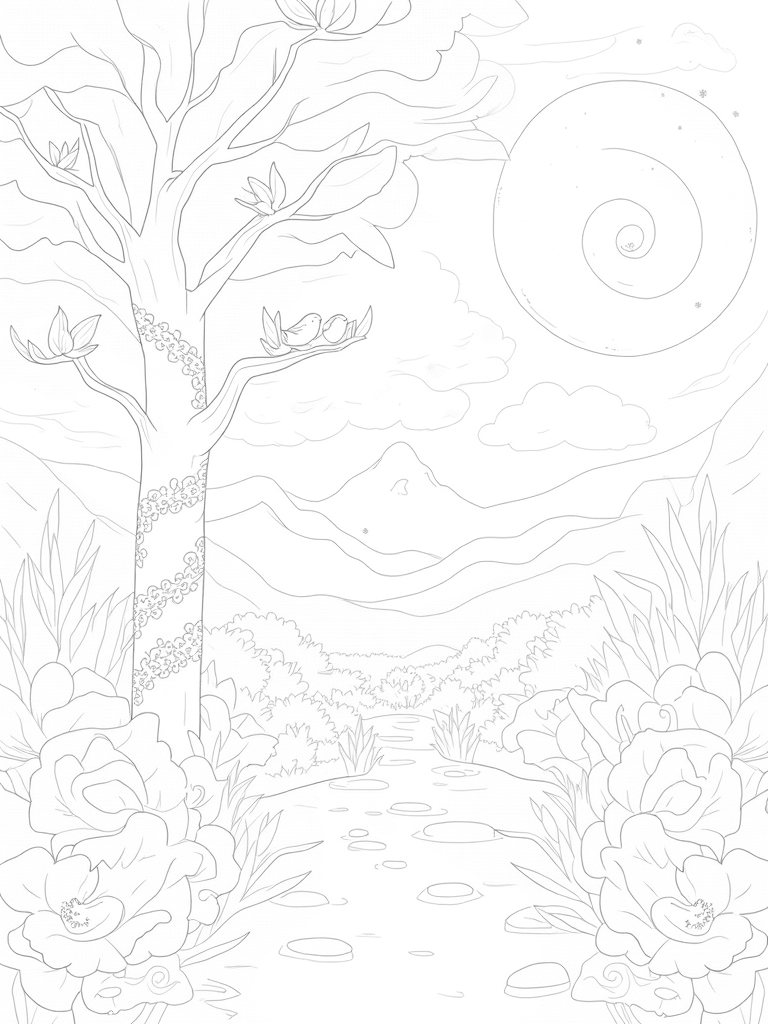 Underneath this grand tree, a crystal-clear stream flows gently, surrounded by smooth stones that you can almost imagine skipping across the water. And look closely, there are doves snuggled up on a nearby branch, adding to the peaceful vibe of the garden. In the background, you can spot a stunning mountain range, its peaks softly defined against a dreamy sky filled with swirling clouds and stars. This scene is perfect for a relaxing coloring session.