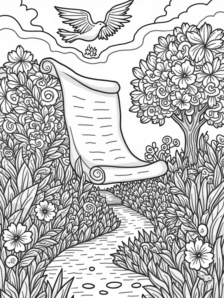 Serene Garden with Tree of Life and Ancient Scroll Coloring Page