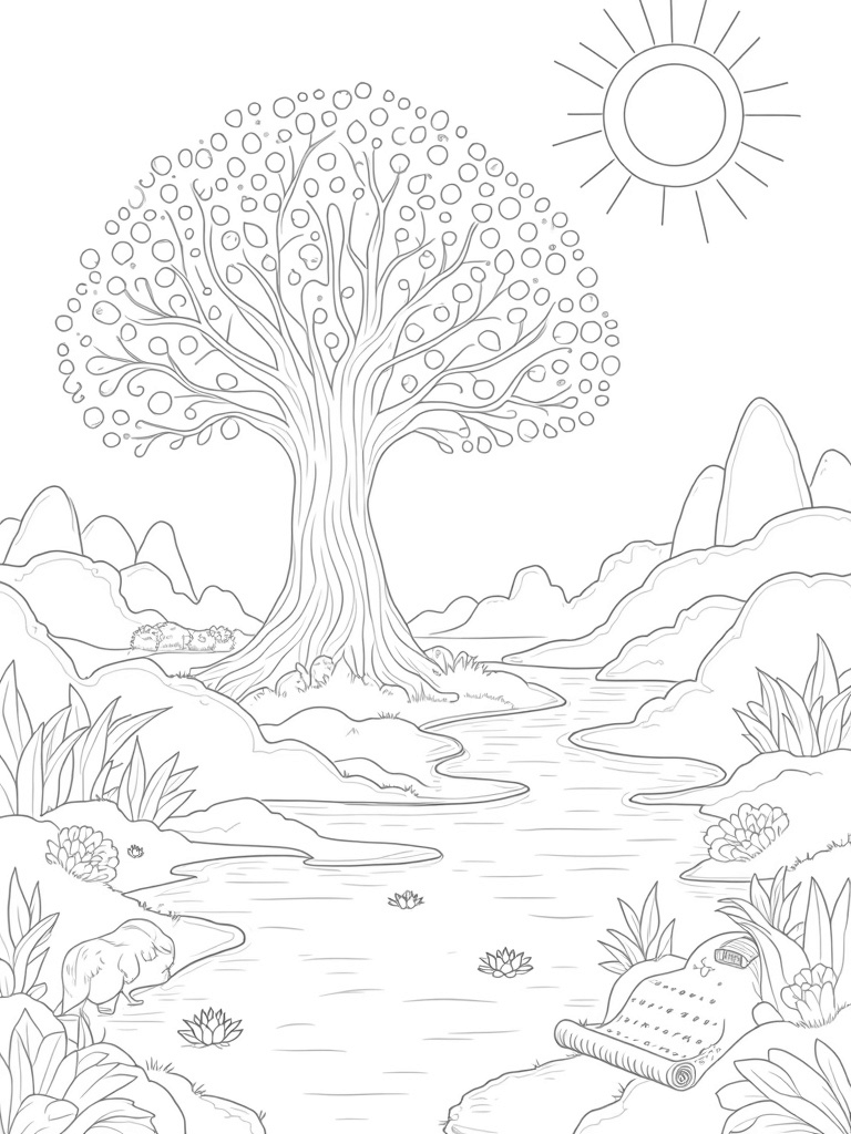 This lovely scene brings to life a tranquil garden under a bright sun. At the heart of it all is a magnificent tree of life, its branches stretching wide and heavy with colorful fruits. A gentle river winds around it, its banks lined with smooth stones, while delicate lilies float gracefully on the surface. You can also spot an ornate scroll nearby, revealing some ancient script, adding a touch of mystery to the garden.