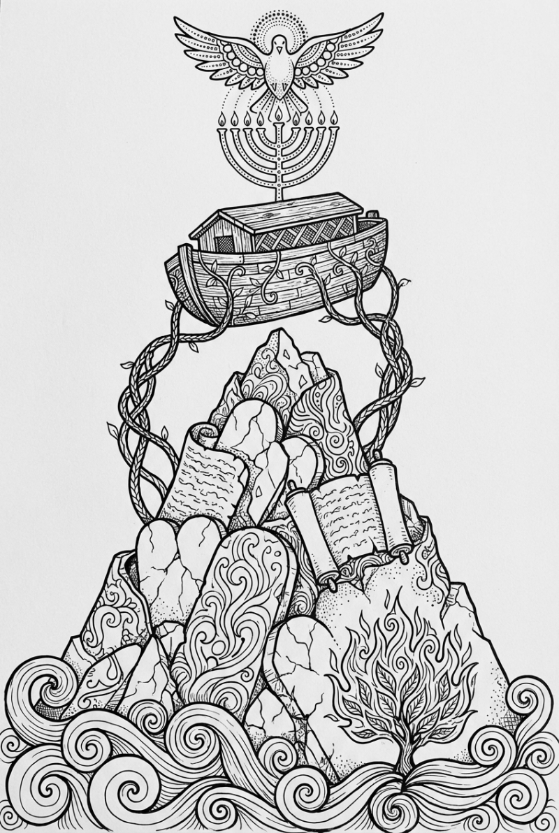 On the left side a radiant dove spreads its wings over a glowing menorah, casting soft light across the scene. At the base of the tablet mountain a burning bush flickers with gentle flames, adding a warm glow. The line work is full of cross‑hatching and swirls, so you can play with textures, from the rough stone to the smooth scrolls.