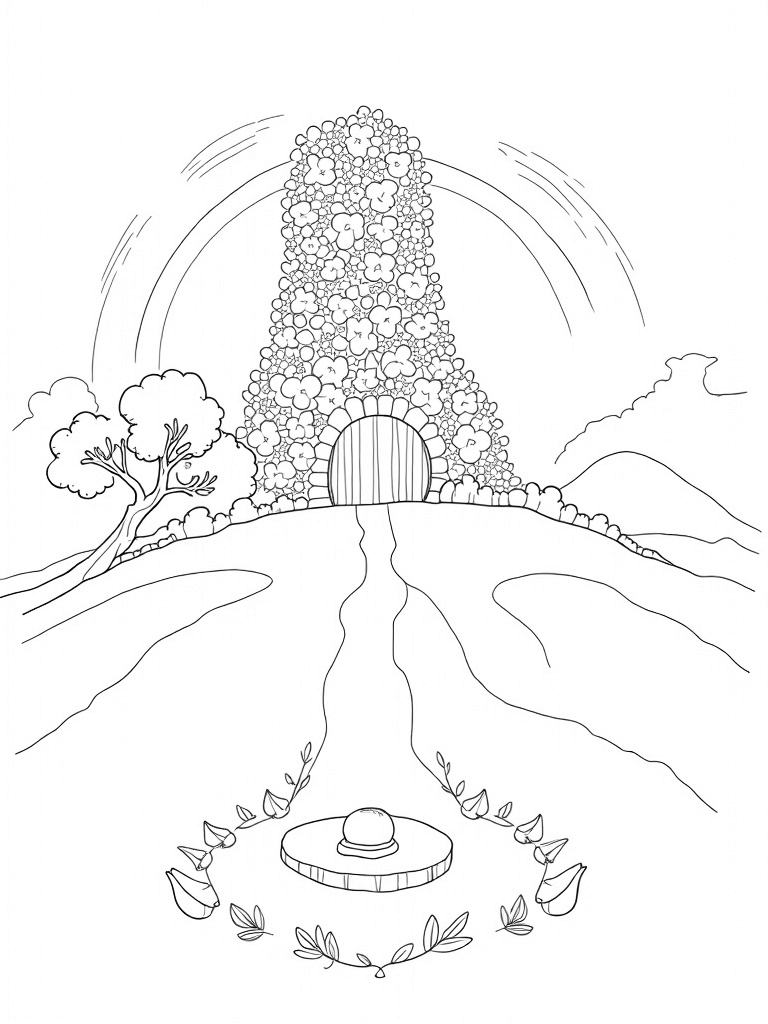 Nearby, a large olive tree spreads its branches wide, providing shade for the peaceful gathering below. Doves and olive branches circle around a small stone altar, creating a serene atmosphere. It's a lovely blend of nature and imagination, perfect for kids to color and bring to life!
