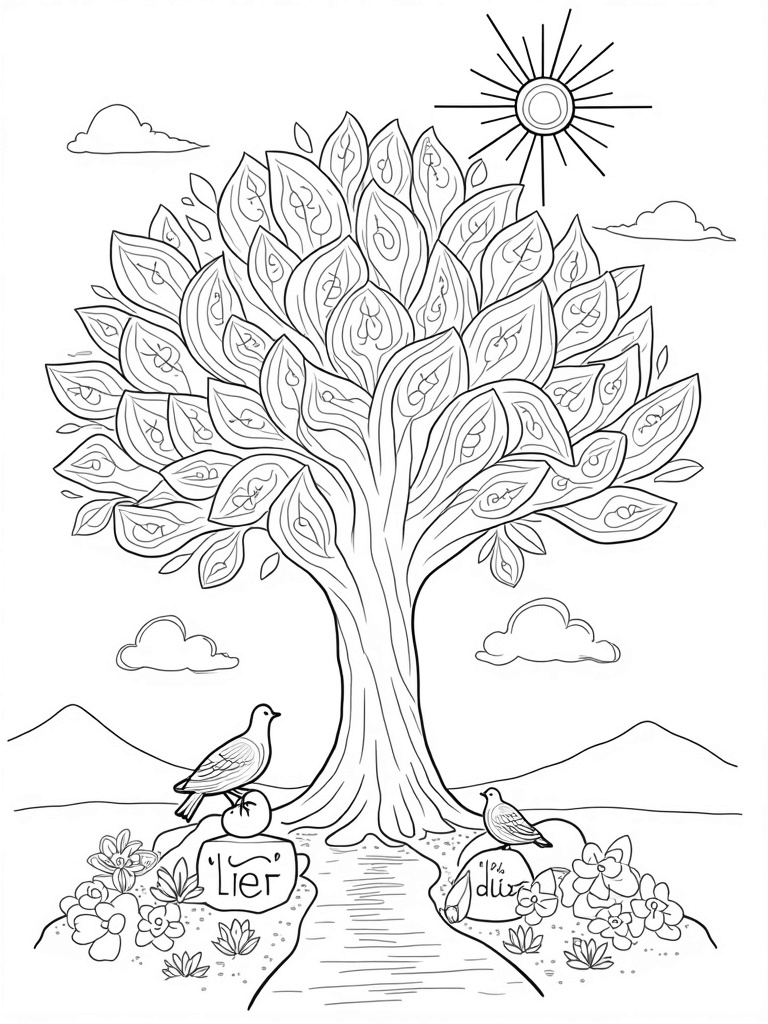Perched on one of the tree's branches, a pair of doves adds a peaceful vibe to the picture. These friendly birds seem to be enjoying the breeze, surrounded by floating scrolls that flutter around them. It’s a perfect spot for little ones to color and create their own stories about friendship and love.