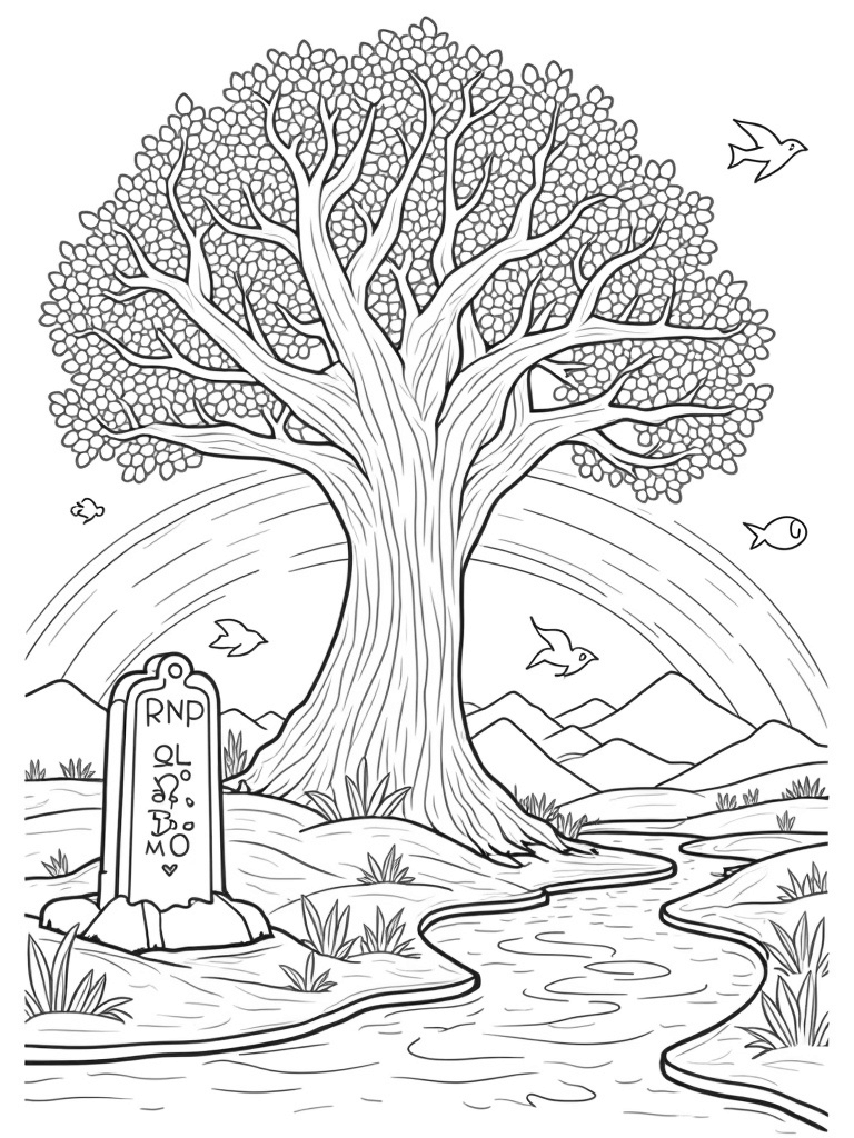 This coloring page showcases a magnificent tree of life, its branches twisting and turning in beautiful patterns. The leaves are shaped like hearts and stars, adding a special touch. Below, a calm river flows, and you can spot cheerful fish jumping out of the water. On the riverbank, there’s a stone tablet with mysterious symbols, and a vibrant rainbow arches across the sky, connecting two distant mountains.