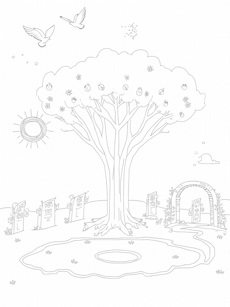 Take a look at this beautiful tree of life! Its wide, intricate branches stretch across the page, filled with colorful fruits and lush leaves. At the base, there's a serene pool that reflects the vibrant foliage above, surrounded by delicate flowers. Just nearby, a winding path made of stone tablets leads to a lovely archway draped in vines and blossoms.