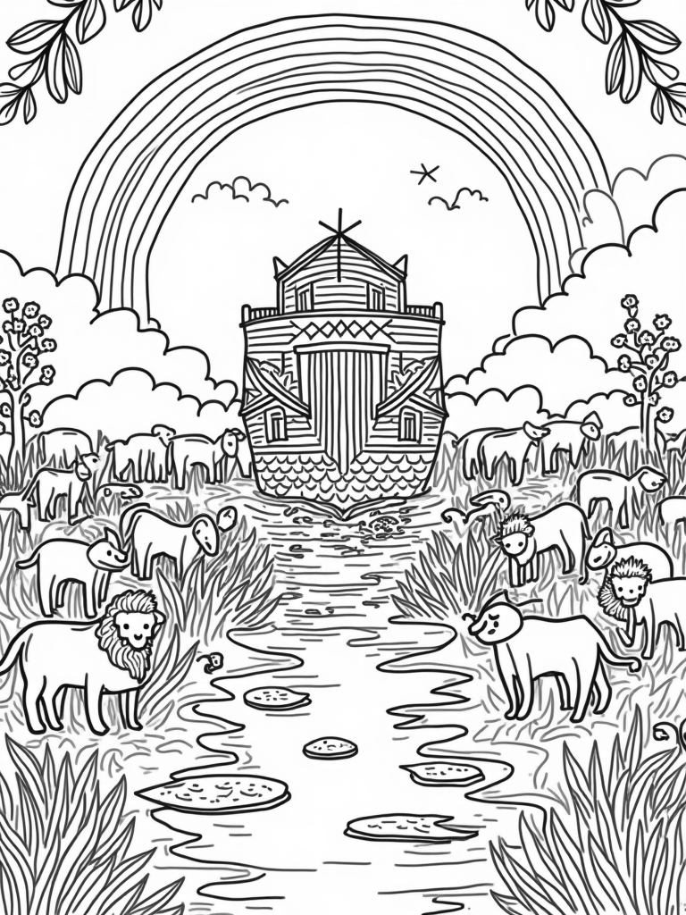 Above the ark, a cheerful rainbow stretches across the sky, accompanied by stylized clouds and warm sunbeams. Below, a gentle river winds through the garden, filled with lily pads and little fish swimming around. The corners of the image are beautifully framed with olive branches and grapevines, adding to the overall calm and harmony of the scene. It’s a perfect spot to let your creativity flow!